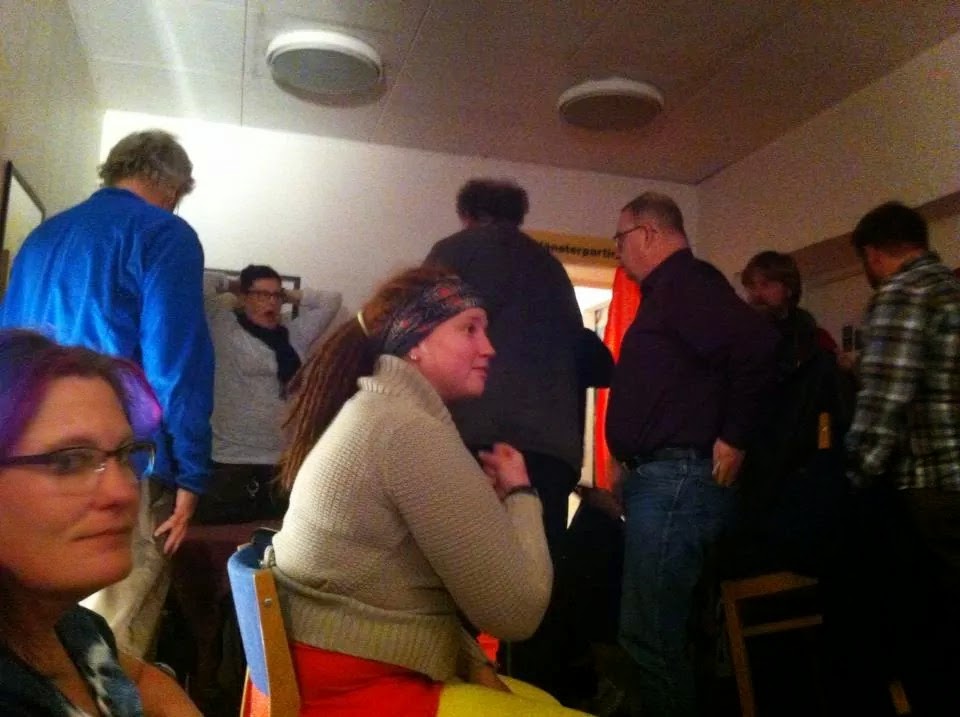Vi började med separatistiska möten, där kvinnor och män hade korta möten på olika platser. Jag vet inte vad männen gjorde, men vi kvinnor fick prova att ställa oss i en talarstol och presentera oss, med mikrofon och allt. Vårt möte leddes av Margaretha Cannerfors och Nidia Åhman. Männens möte skulle ha letts av Linn Wegemo, men där var vi några som protesterade på mötet som distriktstyrelsen hade tidigare i veckan. Vi var några som tyckte att männens möte skulle ledas av en man, nämligen. Ska det vara separatistiskt så ska det, och det skulle ha blivit vilda protester om kvinnornas möte leddes av en man, eller hur? Feminism i all ära, internfeminism är väldigt viktigt och det behövs, men det behöver inte gå till överdrift, tycker jag. Vi vill ha jämställdhet, inte ett matriarkat, tänker jag.